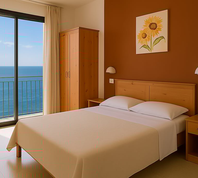 Accogliente camera con letto matrimoniale, aria condizionata e vista sul mare, perfetta per un soggiorno rilassante.